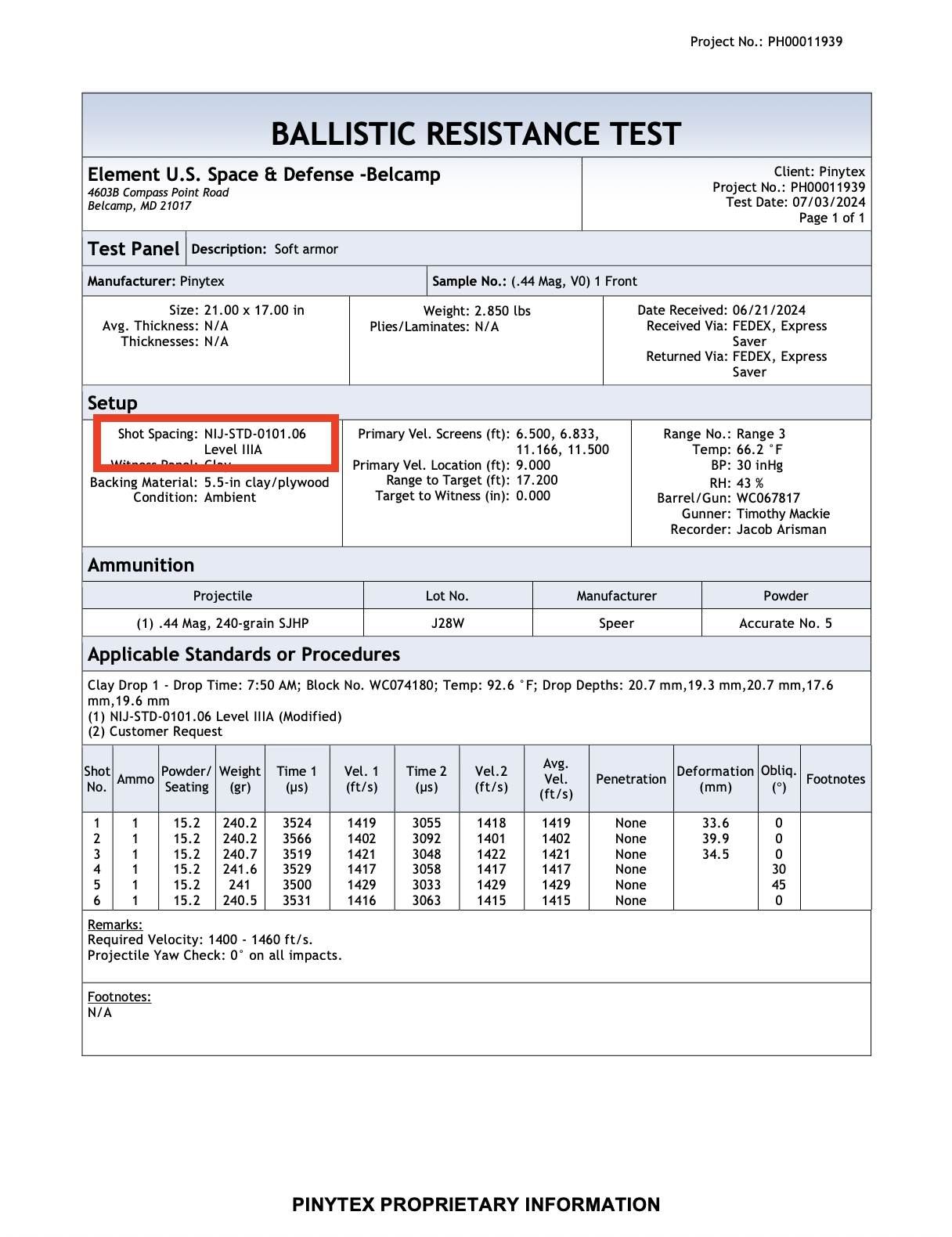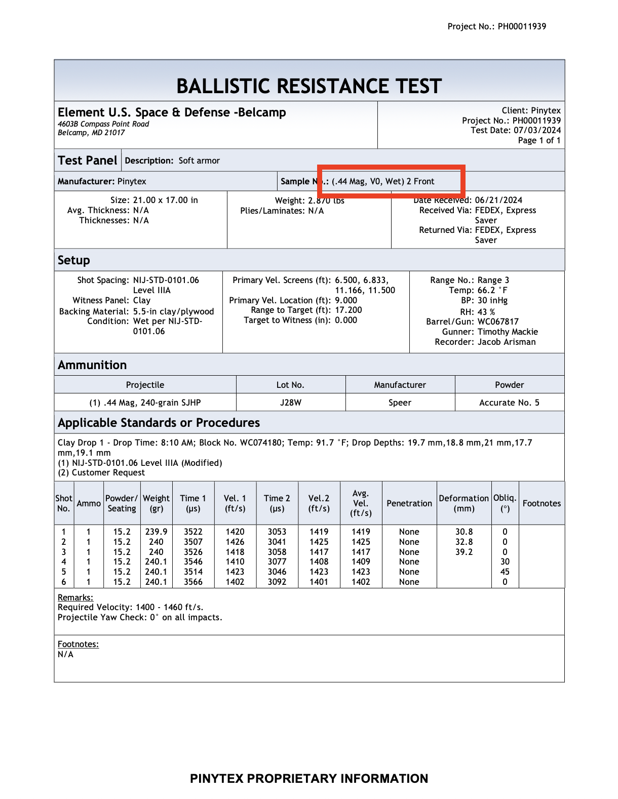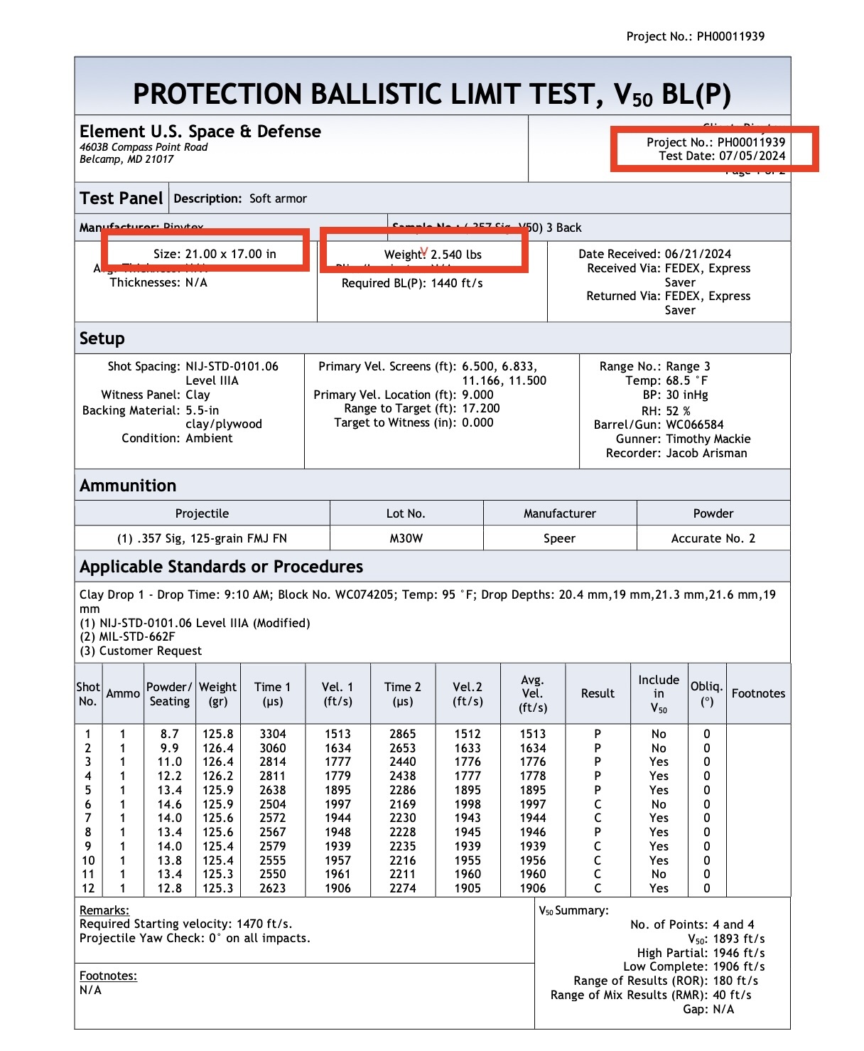 這代表它用的是 0101.06 這套身體防護衣標準架構,且以 Level IIIA 的手槍威脅為核心。 換句話說,這份報告首先是在告訴你:這不是步槍硬板報告,而是軟式防護系統的高等級手槍威脅測試。