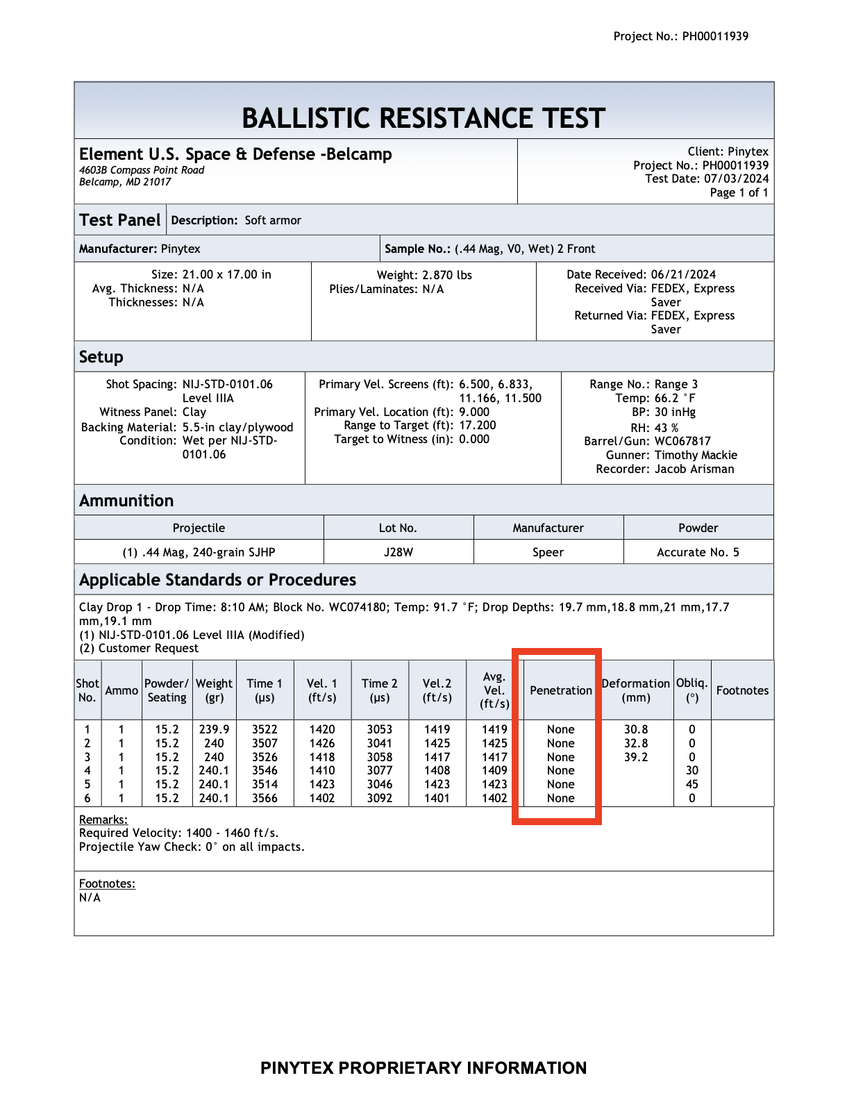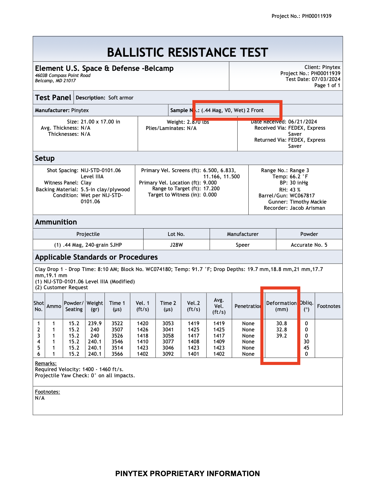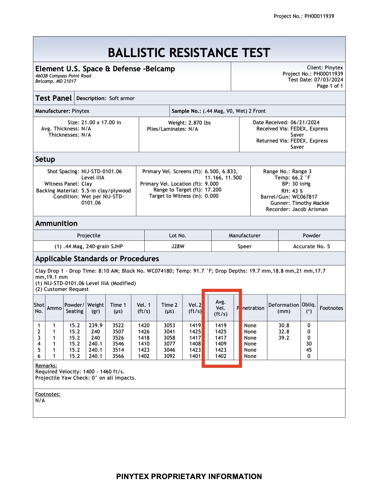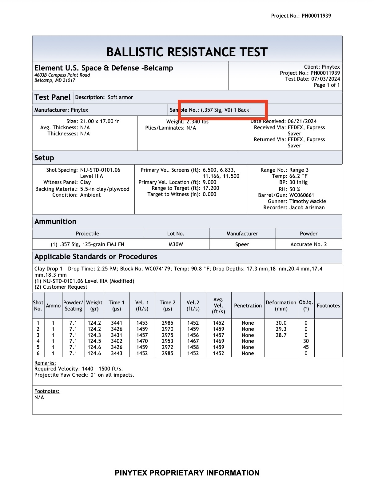 這代表它用的是 0101.06 這套身體防護衣標準架構,且以 Level IIIA 的手槍威脅為核心。 換句話說,這份報告首先是在告訴你:這不是步槍硬板報告,而是軟式防護系統的高等級手槍威脅測試。