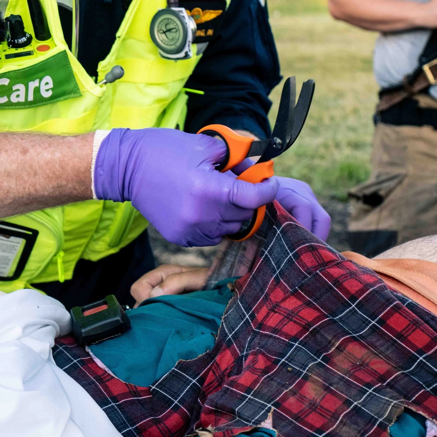 暴露並非單純把衣服剪開。實際環境裡,患者常穿著多層衣物+戰術背心+護具+織帶+配件甚至軍靴,布料受血液、汗水或雨水浸濕後緊貼皮膚,稍有不慎便可能造成二度傷害、牽扯導管或延誤後續處置。此時,一把能夠長行程剪切、濕手穩握、剪線可控的工具,決定了你能否把「看不見的傷口」變成「可處置的傷口」。