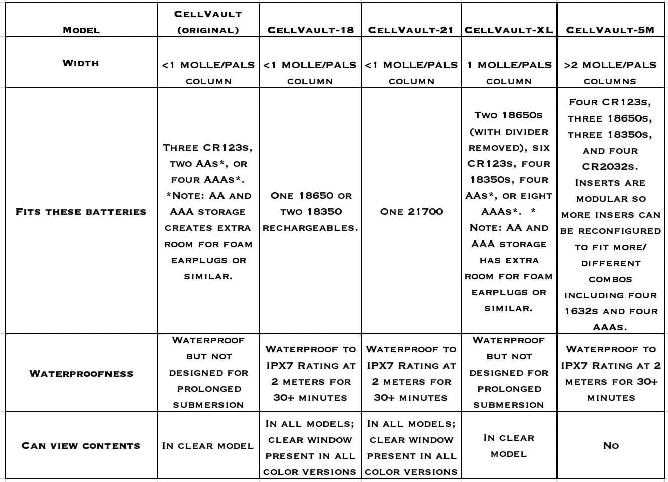 Thyrm CellVault、CellVault XL、CellVault-18、CellVault-21和CellVault-5M是防水、可連線的齒輪解決方案。 它們被設計用於儲存電池,但可以在食品安全塑膠中儲存許多東西,包括生存裝備和藥品。 您可以閱讀此產品線(PDF)中所有CellVaults的目錄。