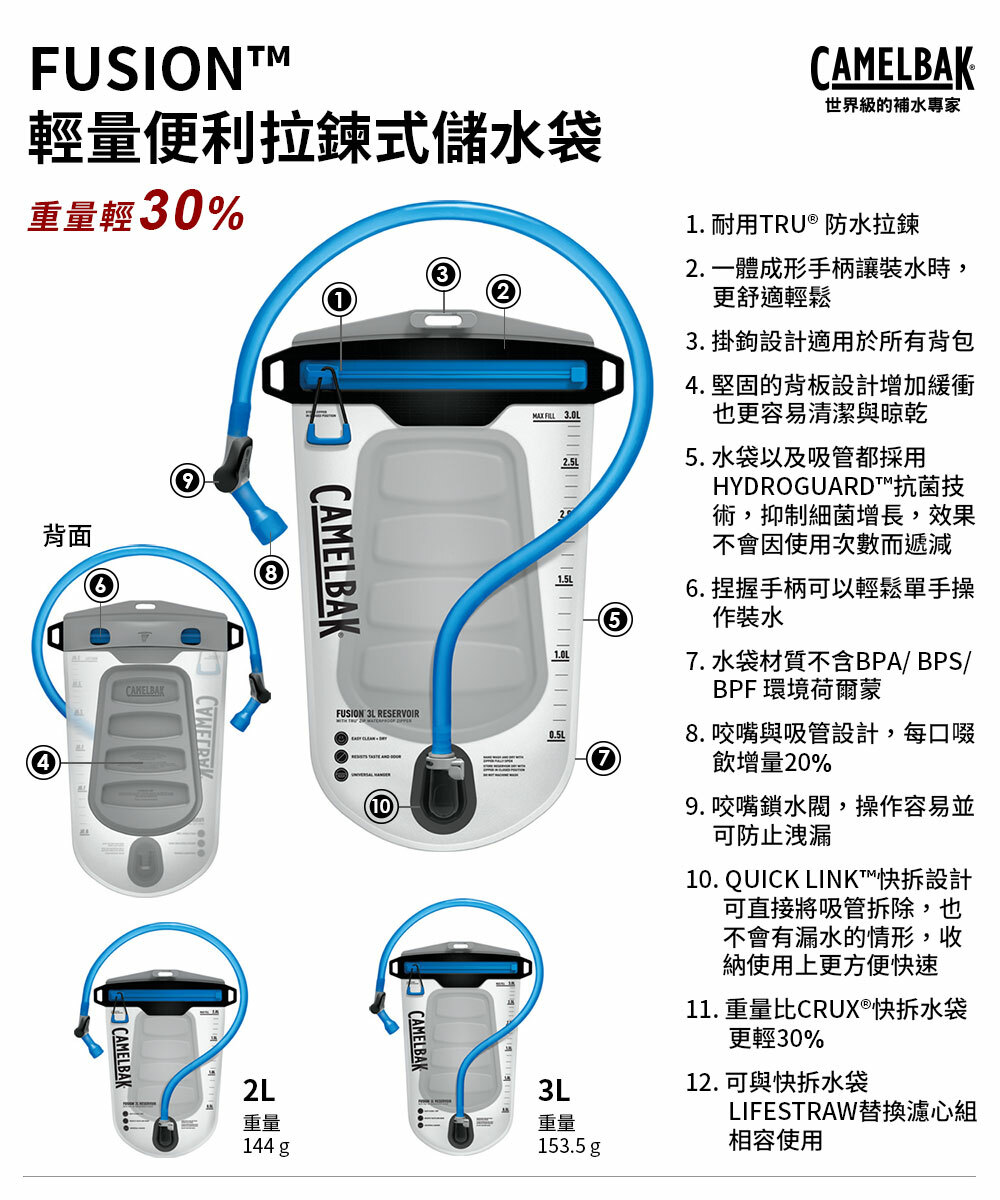 CAMELBAK FUSION™ 2L 輕量拉鍊式快拆水袋,採用創新 TRU® 防水拉鍊設計,搭配一體成形手柄與 QUICK LINK™ 快拆系統,提供輕量、耐用且易於清潔的補水解決方案,適合登山、越野跑與長途騎行等戶外活動。