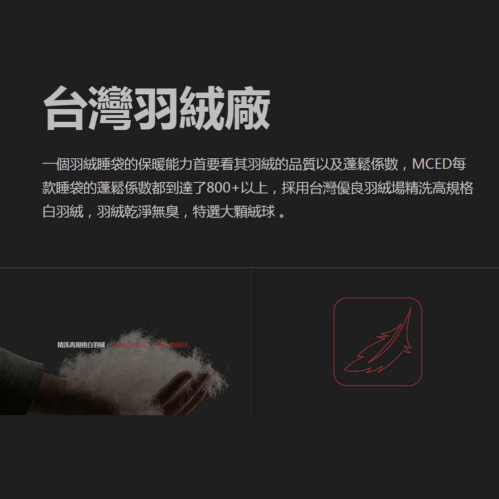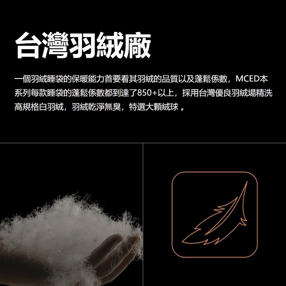 MCED 獵戶座 DG-800 信封型羽絨睡袋,採用日規 JIS 95/5 精選白羽絨,蓬鬆度達 800+FP,提供卓越的保暖性能。加寬加大型設計,展開尺寸達 225 × 85 cm,適合身形較高大或喜愛寬敞空間的使用者。20D 抗撕裂尼龍布料,兼具防潑水與透氣性,適合各種戶外環境。