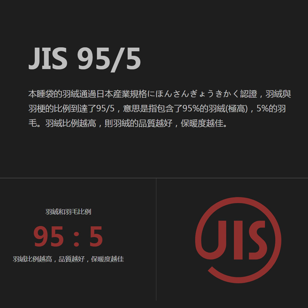 羽絨 : 日規JIS精選白羽絨 (羽絨95%、小羽毛5%)