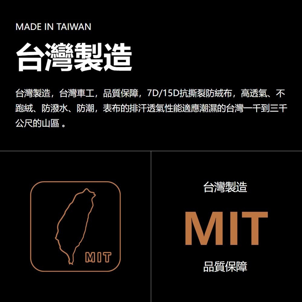 內 / 外 20D 抗撕裂尼龍布,高透氣、不跑絨、防潑水、防潮